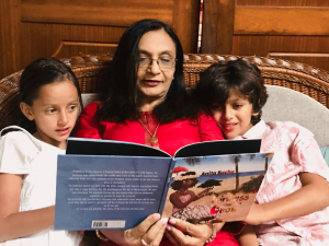 Reading the story of The Princess and the Crow to my grandchildren, Yogen and Maya, on Easter Monday. Yogen and Maya are pupils at the British International School of Kuala Lumpur. They came to Mauritius to spend Easter holidays with me. They are born of a Norwegian mother and a British Indo-Mauritian father. They love to read and to listen to stories about children, birds and magic.