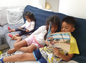 Malachi and Kayla Jay are reading their new story book, THE PRINCESS AND THE CROW. They are the grandchildren of Rekha and Jam Dookna ,who live in Stratford, London. Their grandparents were born in Mauritius Island. They later settled in England ,where their father was born. They have not travelled to Mauritius or to any other part of the world yet. They are discovering an island surrounded by the sea for the first time. They discover that children who live on an island under the sun have darker skin, that the birds, flowers and fruits are different in a tropical country.